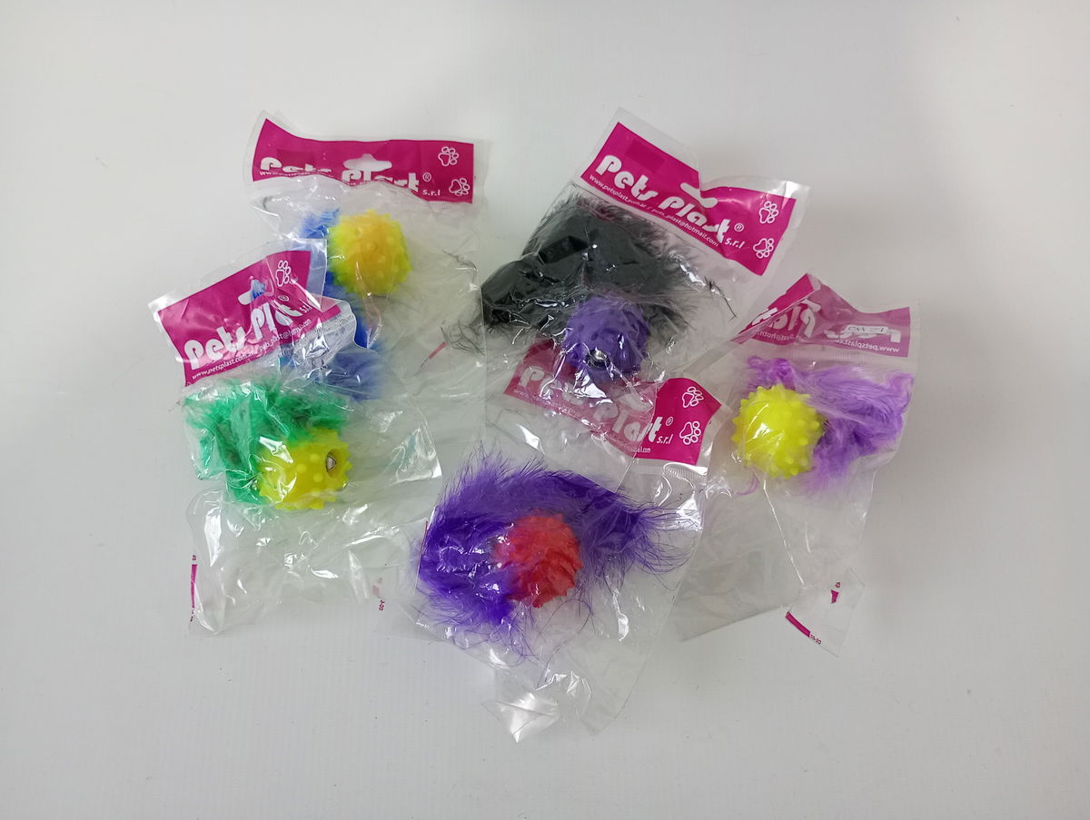 PELOTA DE GOMA CON SONAJERO Y PLUMAS